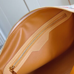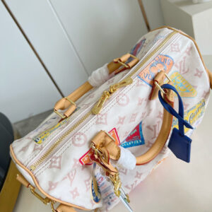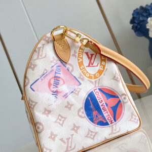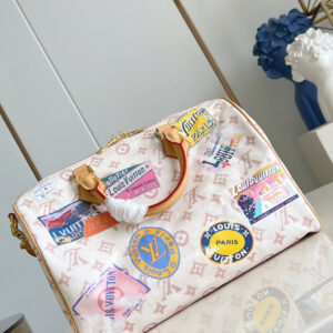 La borsa Speedy Soft 30 rivisita l’iconico motivo Monogram Dune con un’inedita finitura d’ispirazione vintage. Il modello è impreziosito dal charm a forma di aeroplano e da etichette effetto patchwork, che rievocano quelle della collezione originale di Gaston-Louis Vuitton. L’accessorio può essere portato anche a spalla, grazie alla tracolla più lunga.